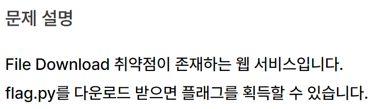 File Download 취약점이 존재하는 웹 서비스입니다. flag.py를 다운로드 받으면 플래그를 획득할 수 있습니다. Reference Introduction of Webhacking
