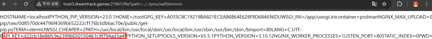 웹 서핑을 통해 apikey는 /proc/self/environ 경로에 위치한다는 것을 알아냈다.