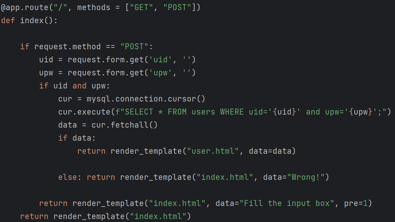 SELECT * FROM users WHERE uid='{uid}' and upw='{upw}';