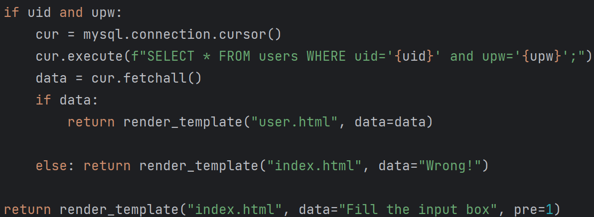 SELECT * FROM users WHERE uid='{uid}' and upw='{upw}';