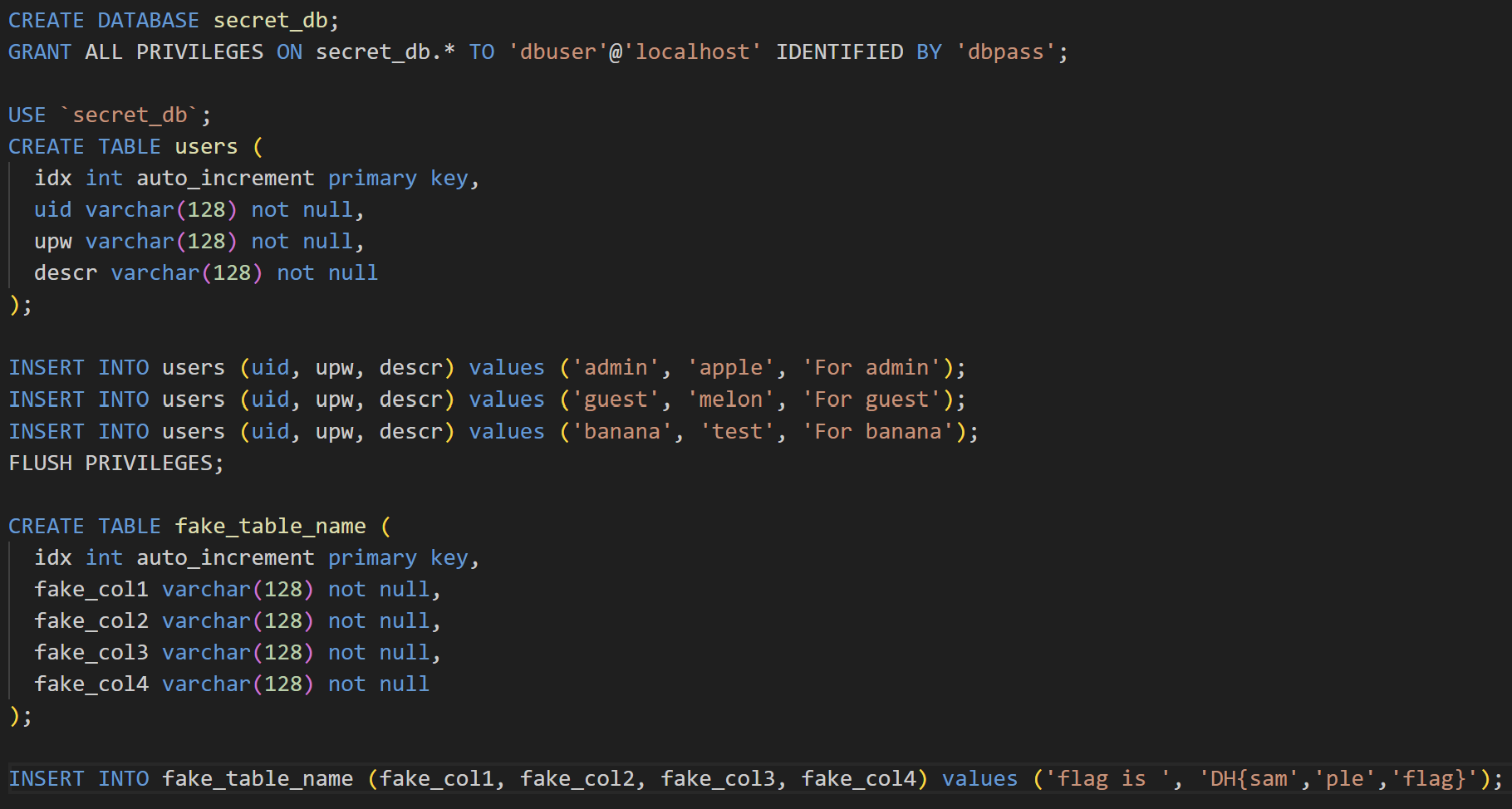 이 파일을 보았을 때 총 4개의 컬럼과 사용한 DB로 추정되는(secret_db) DB를 알 수 있다.