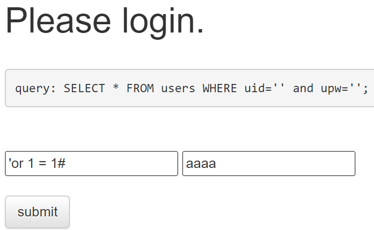 ∴ SELECT * FROM users WHERE uid=''or 1 = 1#' and upw=aaaa이 되어 users 테이블의 모든 값들을 가져온다.
