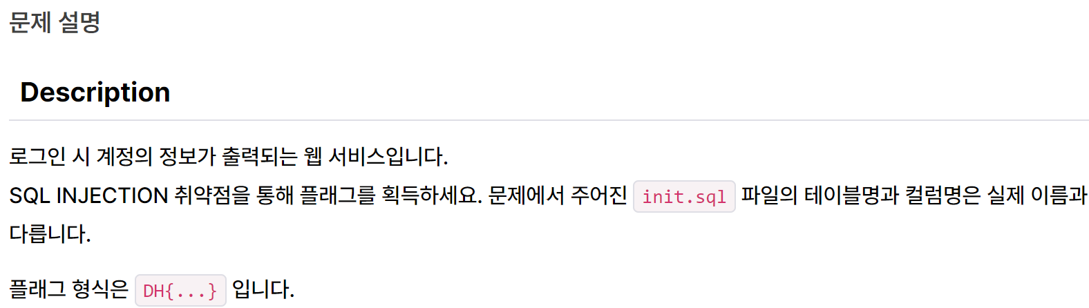 Description 로그인 시 계정의 정보가 출력되는 웹 서비스입니다. SQL INJECTION 취약점을 통해 플래그를 획득하세요. 문제에서 주어진 init.sql 파일의 테이블명과 컬럼명은 실제 이름과 다릅니다. 플래