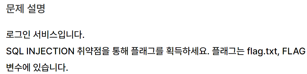 로그인 서비스입니다. SQL INJECTION 취약점을 통해 플래그를 획득하세요. 플래그는 flag.txt, FLAG 변수에 있습니다. Reference Server-side Basic