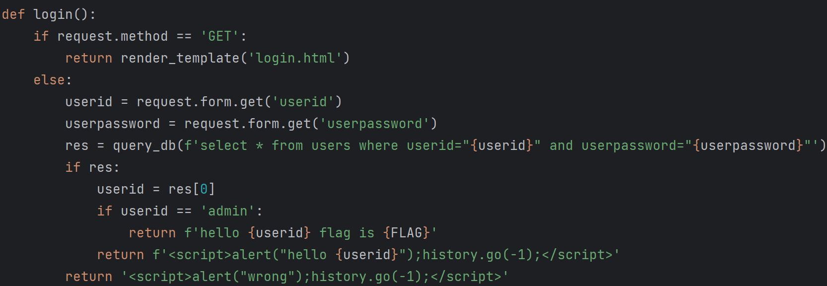 query_db에 sql문을 f 스트링으로 userid, userpassword를 받아와 포맷팅하고 이를 res에 넣어주는데,